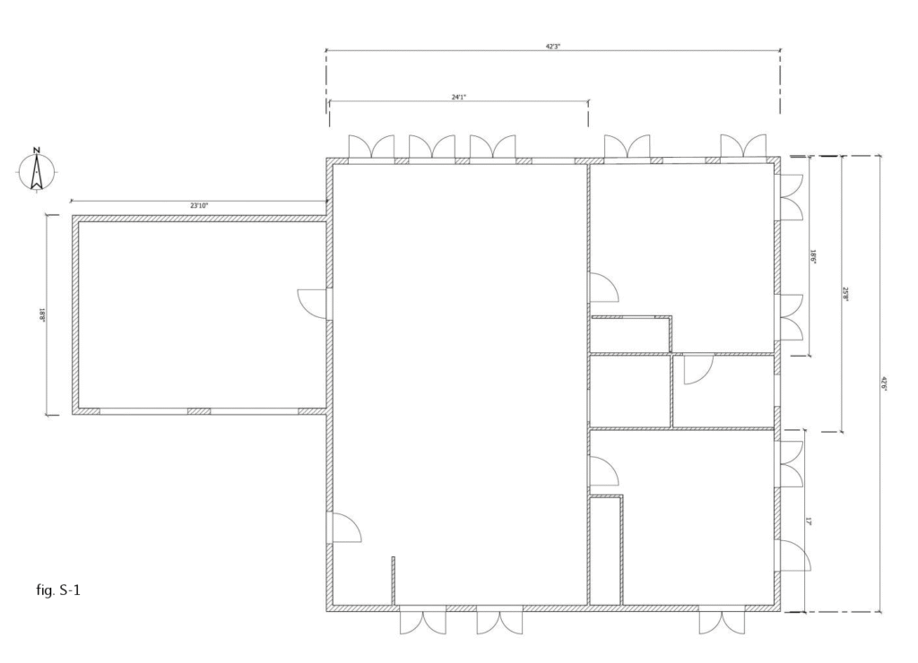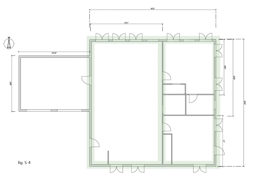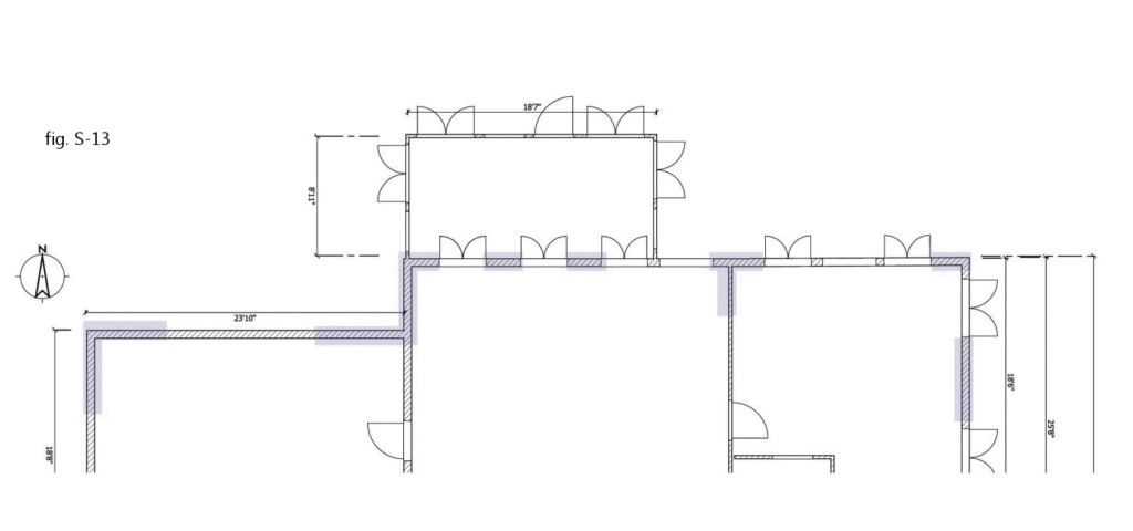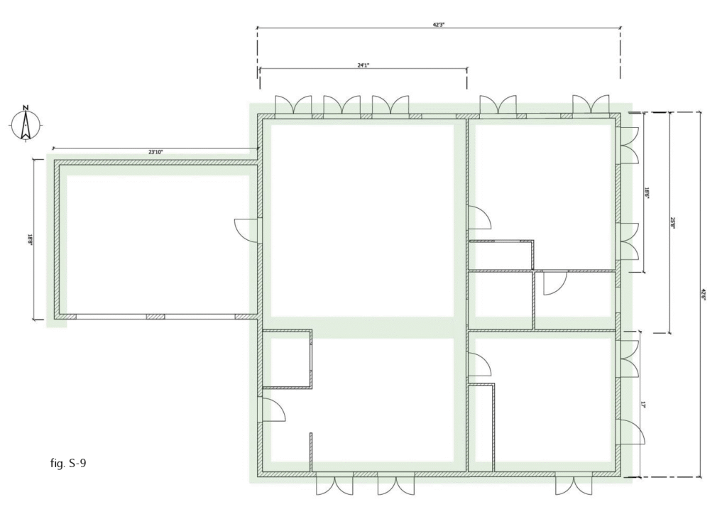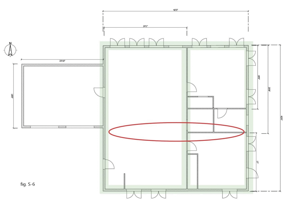 Once more, things appear relatively simple: there are two walls on the east side of the building that can be designated as braced wall bands, such as the one circled in fig S-6. However, there is a problem.
