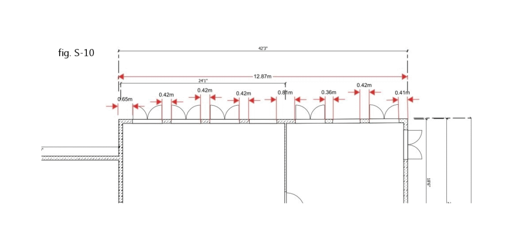 As mentioned above (fig S-8), the general guideline is that 25 per cent of a braced wall band must be comprised of braced wall panels. At first glance, that might make one think that there’s a problem with the detached garage: after all, the south side of the garage features two garage doors, and the gap between them is just two feet – not wide enough for the required 2’6″/75cm length of a panel.