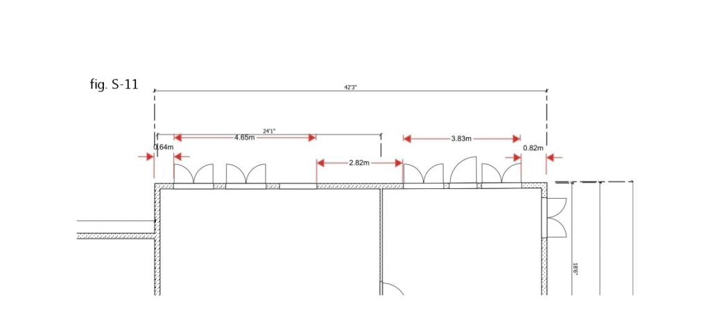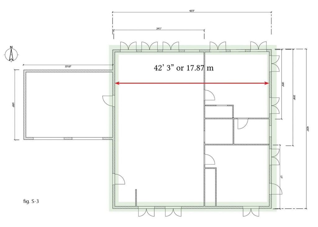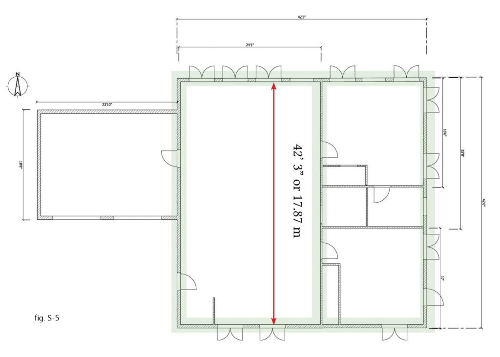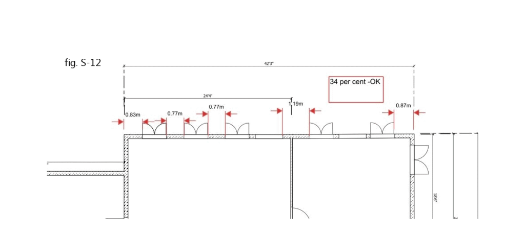 In this plan, there are five 4’4″ windows and two 4′ patio doors on the north building face. At first glance, that’s not a problem, since the windows add up to 21′ 8″ of openings and the doors bring that up to 29′ 8″ – that’s only 70 per cent of the 42′ 3″- long wall – leaving 30 per cent solid. But the plan fails to meet code, because too few of the areas without windows/doors are long enough. In fact, there are several problems: