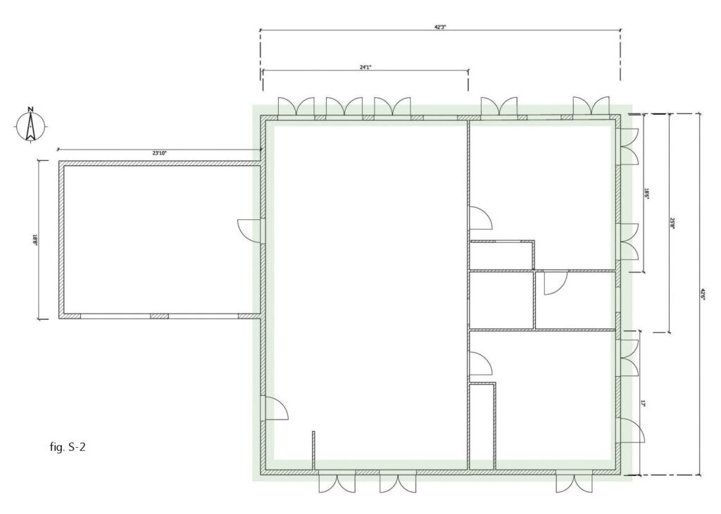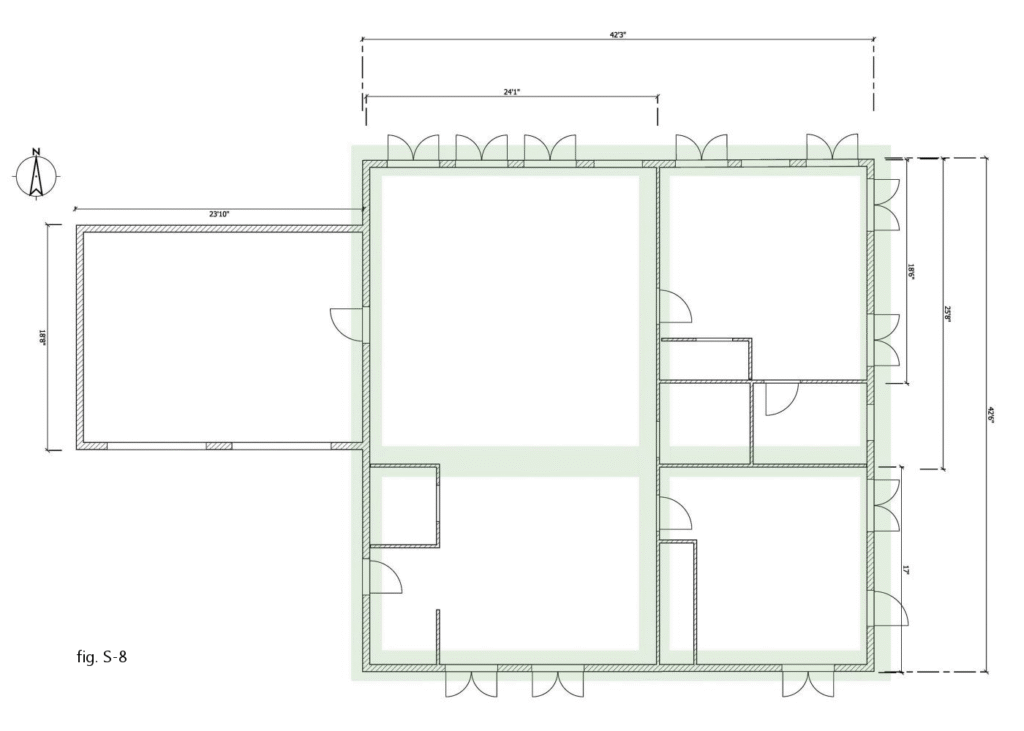 Fortunately, in this example, that’s fairly easy: the plan already intended a 42′-long wall on the interior. Consequently, this wall can also be designated as a braced wall band.