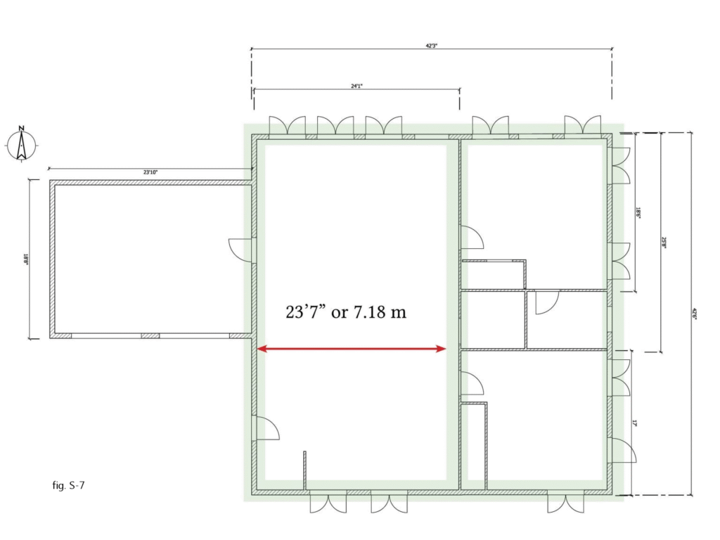 It’s the second requirement that presents a problem: in this typical “open concept” design, the interior walls are 23’7″ – or 7.18 metres – apart.